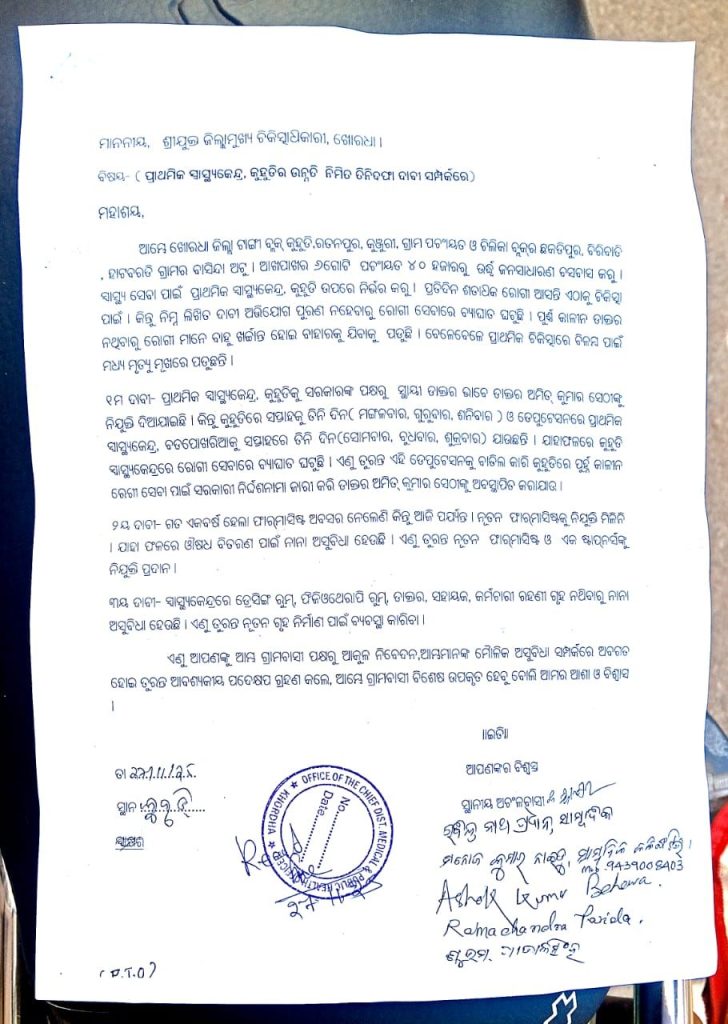ଖୋର୍ଦ୍ଧା ଜିଲ୍ଲା ଟାଙ୍ଗୀ ବ୍ଲକ ଆନ୍ତର୍ଗତ କୁହୁଡି ପ୍ରାଥମିକ ସ୍ୱାସ୍ଥ୍ୟ କେନ୍ଦ୍ରର ଭିତ୍ତିଭୂମି ସମେତ ଅନ୍ୟାନ୍ୟ ସମସ୍ୟାର ତୁରନ୍ତ ସମାଧାନ ପାଇଁ ତିନି ଦଫା ଦାବୀ ସମ୍ବଳିତ ଦାବୀପତ୍ର ସ୍ଥାନୀୟ ଜନସାଧାରଣ ପକ୍ଷରୁ ଜିଲ୍ଲା ମୁଖ୍ୟ ଚିକିତ୍ସାଧିକାରୀ ଙ୍କୁ ପ୍ରଦାନ କରାଯାଇଛି।
